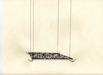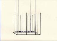 The above drawing is titled: "Tar and Feather Painting, Second Variation" and is a study for large-scale. The piece consists of : stretched canvas, roofing cement(tar), goose feathers, cables and metal hooks. The painting measures 10'x10' x height of ceiling. Four cables are attached to the ceiling and descend to metal hooks. The hooks pierce the corners and/or sides of the painting allowing it to suspend.