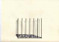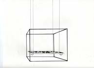 The drawing above is titled: "Tar and Feather Painting, Third Variation". The painting rests on the floor inside of a metal cage. The cage is open at the top. The dimensions on this work are variable as in all of the pieces in this series. What I am giving in size description is an approximation. The cage may work at different heights as well as various design possibilities, i.e., thickness of metal, color of metal, or amount of bars for the cage. This individual artwork can have a few variations on its own. The reason why all of these works are tarred and featherred paintings, displayed horizontally in different structures, is a method of creating visual/spatial/conceptual paradigms. The painting, in and of itself, has become a sign used to inquire as to its own nature, i.e, what is its function? How is meaning read into this medium? Can it really claim to give us a certain form of knowledge? Can painting as a language be presented in a manner that calls its identity into question? The visceral, aggressive treatment towards the stretched canvas and the environment that they are presented within function for me as paradigms that foster thought and arenas that allow for embellishment.