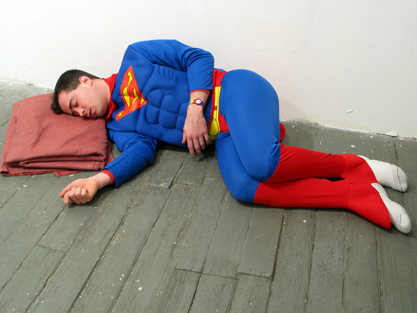 "Superman Sleeps", performance, 2003. I think Superman represents each of our senses of justice and rightness as westerners. Generally speaking, I think those senses seem absent from us right now. Our abilities to rise above the average and really change the conditions of this world for the better are sadly asleep. Thus we have the conditions of things as they are. |