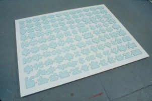 Image above: Feelings, 2003. Braille words carved in soap. Image below: Untitled, 2002.Glass puzzle on lacquered wooden board 60 x 2.5 x 72 inches. |