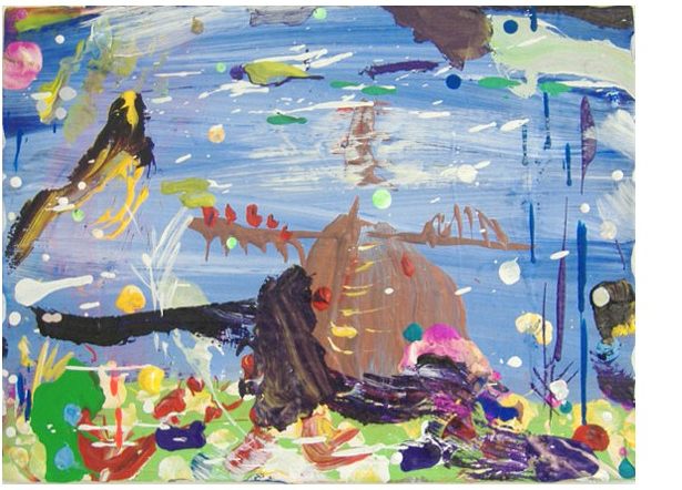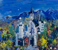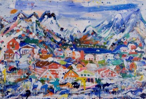 Cass’ application of material conveys a tremendous sense of joy, and also an allegiance to chance and accident as a way to provide points for starting and stopping throughout construction of the piaintings. Heavy build-up of acrylic paint leaves a sculptural impasto on the picture plane inviting the shadow it casts to become a condition of the painting’s effect. The very physical process by which Cass works becomes an almost performative act; spills, smears and violent expulsions are all carefully choreographed to depict cliché European settings in a style that can be described as pop expressionism teetering on psychedelia. “You might deduce…that Cass is a Pop landscapist in the manner of Roy Lichtenstein. A look at the actual work will persuade you otherwise. These big canvases are energetically made with different kinds of brushwork, and indeed paint, and they pulse with a sense of real place. Whether that place is in Norway, say, or the artist’s own head, or both, is, of course, quite another thing.” – Anthony Haden-Guest.