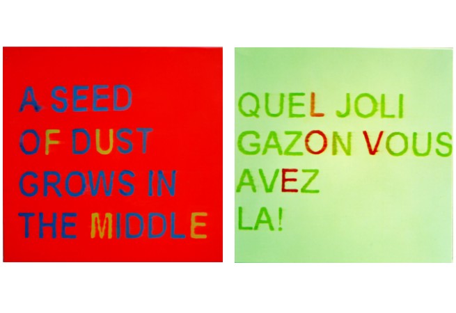 My aim is to efface the borders between literature and fine arts by creating a ‘visual book‘. Living in an Anglo-Saxon country for three years has incited me to work with the ambivalence of language; translations and sonorities, and to enlarge my lexicon to include bilingual associations and letter dissociation. Contemporary poetry and literature are the bases of my research. Colours and Words offer a double reading of personal texts. By highlighting specific letters with a different colour, I invite the viewer to play and find a pun on words inside each sentence. Some words create a poem along different canvases. An interplay between the meaning of the words and their colours exists within the canvas, while this word and colour game is also at play between the entire installation of canvases. |