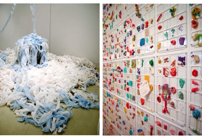 ‘DNA : Making A Mark’ ( top right image ) is an interactive piece which celebrate individualism and identity. DNA testing is done by extracting DNA from chewing gum. In my piece, people chew and stick gum to clear plastic grids on the wall, and sign their names- thus encoding DNA, fingerprints,gesture, and signature all at once. Over time, the grids transform into an abstract artwork which encodes individuality and gesture – a collective portrait of people's personal expressions. – – – ‘24/7,’ ( top left image ) comments on the nature of the sweatshop. Two Sewing machines run continuously, one sewing brightly colored threads onto an endless loop, the other sewing thread onto rolls of toilet paper which pile up in a giant mound on the floor.
