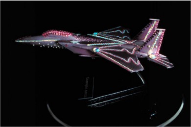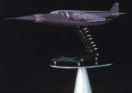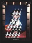 In a speech promoting ‘the war on terrorism’ President GW Bush stated that we fight it overseas and we fight it at home. In my body of work Lingual Discharge I have recontexualized quotes from the rhetoric of the war on Iraq. These quotes include Donald Rumsfeld, President Bush and President George Bush the Elder because they represent the dominant military power structure. – Even though quotes such as ‘Make no mistake we will do what it takes to win’ were made in reference to the war on Iraq for me they also act symbolically to represent the War on American Civil Liberties. The primary objective of this war is to maintain a masculine ideal that does not include feminization or penetration of their power. – Lingual Discharge is a (re)presentation of models of military aircraft that have been redesigned to reject the codification of hyper-masculine objects of war. The military drag has been recoated with another drag that is ‘military lavender’ and designed with pearls, and pink, white and purple Australian lead crystal rhinestones. Each plane is perched upon a shaft and a leather covered base with a plaque that is inscribed with quotes such as ‘They are brutal, brutal people.’ Then each piece is balanced on a very large shiny bullet.