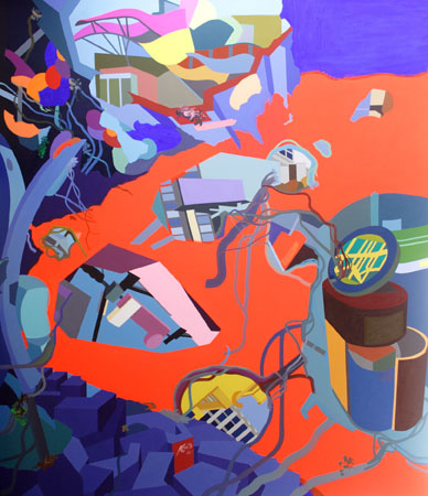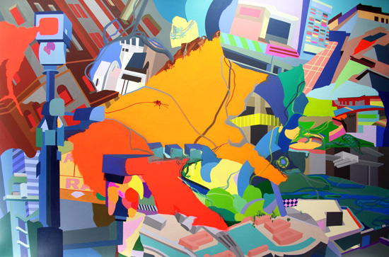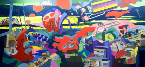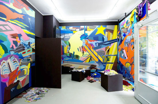 The central theme of the exhibition involves the question of how to constitute real event spaces located at an interface between fiction and reality. Starting with the condition of totality, Ackermann has completely refaced the walls of the front gallery room with five oil paintings. At the true to scale ratio of 1:1 the canvases are assimilated to the format of the gallery walls; 300 to 600 cm long and 238 cm high. The artist makes no differentiation between the significance of various spatial situations. The hallway that leads to the rear gallery area is equipped with different mountings, and thus can be seen as an equivalent component of the show. Here, however, Franz Ackermann works with varied media. The use of traditional Turkish kilims (woven floor or wall rugs) allows for a correspondence between the floor and the ceiling, while also enabling a breakaway from the closed system. The medial diversification in the rear gallery area causes a breach in the homogeneity which Ackermann creates in the front exhibition space with the precise panelling of the walls. Along with the integration of photography as collage, an earlier piece is included in the show; a small mental map. The inclusion of this cartography of memory is Ackermann’s reference to his previous exhibitions, as well as a reinforcement of the concept of subjectively appropriating an area.
