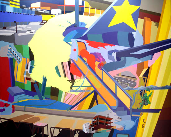 Franz Ackermann defines the presence of a concrete space with the illusionist means of painting, hereby making the painting into a constitutive part of the actual way the space is experienced. In this he is pursuing an intervention in appearance and reality, as one can witness in heterotopous places. At this point the artist assesses a link to a terminal, which possesses no specific function as a real, existing place outside of its efficacy. He takes up the nature of this condition in form and content within his exhibition concept. As a place between places, a room emerges here that is evident, yet borne by lacking veracity. Ackermann intends to create such an altered cognitive situation in the gallery, moving between time and space analogously to the in-between-situation of an airport terminal. As a reloading point the terminal embodies the topic of travel so intrinsic to Ackermann’s work perfectly.