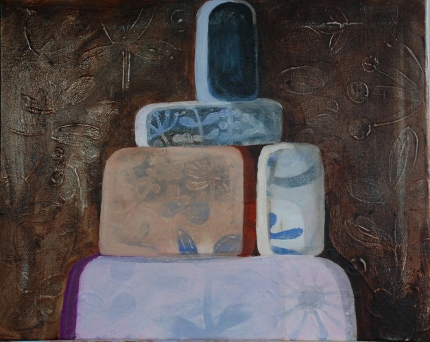 In this process-oriented approach to painting, the artist cares for the physical qualities of material and surfaces. Starting with a failed painting, scraping, sanding and glazing to create a ground which is the foundation for the subsequent layers. Different kinds of paint application are used to create a range of mark making; flat matte washes, scribbly lines, crisp silhouettes, stencils, sgraffito. There is a visual pleasure of discovering forms that harmonize but do not align. Colour is used to evoke different atmospheres; playful, poetic, murky, intimate, ancient. It can be an overall mood tone or a surprise element as when small segments of brilliant colour are dropped into fields of neutral tones. Through a series of micro aesthetic decisions Heather alters and edits elements in and out of the painting, seeking a balance that is both light and weighty. This physical and psychoanalytic act of re-ordering gives value to the buried layers of the painting as well as the surface. This is a layered and intuitive process in which each painting hides and reveals in differing measure, inviting the viewer to linger longer in the enclosed world.