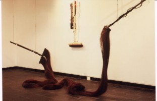 ABOVE IMAGE : – Barometric Distillation No. 2 – (Eucalypermian) Medium : Coal (Wakkerstroom lossopteridales), blue gum leaves (Eucalyptus Globulus Myrtaceae), vaseline, vinegar, perspex, bronze, resin, zinc-plated steel and steel riggings. 2003. Dimensions: (H) 3000mm x (W) 400mm x (D) 300mm. – – – RIGHT IMAGE – Suspended Sentence (part 1and 2) – Medium : Brooms, shamboks, perspex, resin, steel, vinegar, Port Jackson Willow (Acacia Cyclops) and coal (Wakkerstroom Glossopteridales) 2003. Dimensions: Of whole installation: (L) 7m x (H) 2.7m x (D) 2.5 m |