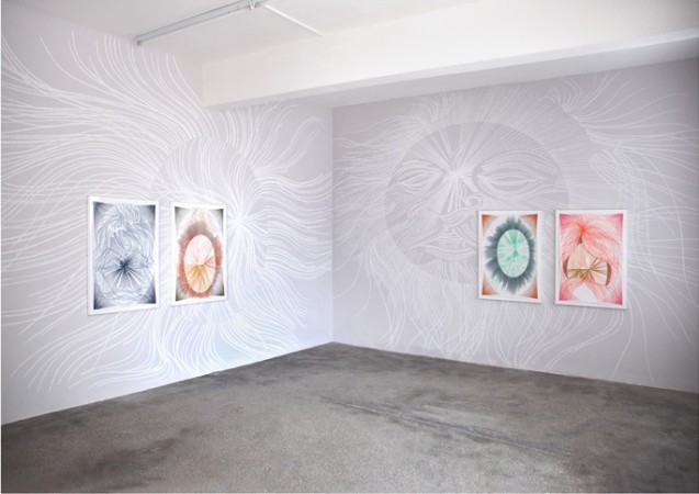 Der Titel der Ausstellung "Sonnenlicht" benennt die vitale Energie die in den Arbeiten steckt und bezieht sich auf die die Waende bedeckende Kreidezeichnung, die mit ihren Strahlen die komplette Galerie ausfuellt. Die Wandzeichnung breitet sich, von den Papierarbeiten ausgehend, wie ein Echo ueber den Raum aus und verwandelt die Galerie in einen obskuren Kultraum. Christliche Assoziationen vermischen sich mit aztekischem Sonnenkult und Kinderbuchillustrationen.