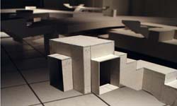 Hallesches Tor is a model-like replica of a Berlin pedestrian underground tunnel linking platforms of the subway network. Here space is excavated: the complex carved-out corridors of the pedestrian tunnel become the �positive� of hidden space. The tunnel, and its human traffic, is transformed into a sculptural object. Attached to both ends of the tunnel are working reproductions of the digital countdown clocks that announce arriving and departing trains. From small speakers placed inside the tunnel the continuous music of the street musicians who play there, as well as the rushing footsteps of commuters, can be heard.
