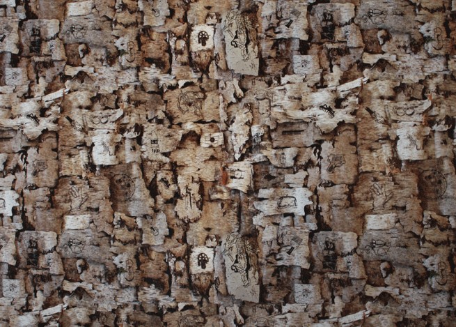 Silverbeach, intallation view, National Museum of Nairobi, Kenya Wallpaper, digatal print derived from drawings of collected objects on silverbirch bark