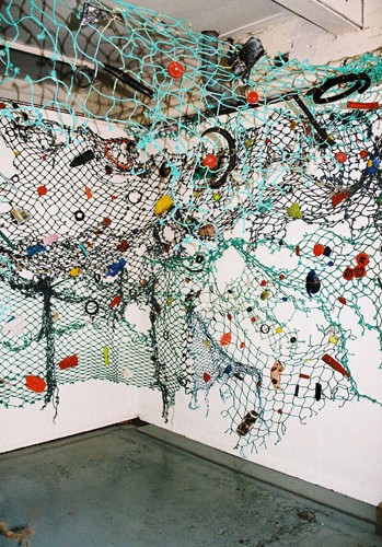 Site-specific work constructed with discarded plastic rings and metallic wire.