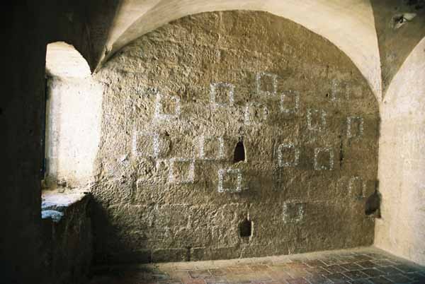 Acrylic paint on found wood, a response to hundreds of years of graffiti on the surrounding walls