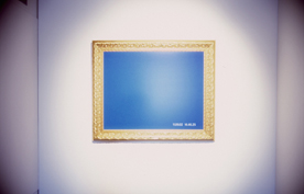 Documentation picture from the opening of the exhibition 'All that is solid melts into air' at Galley Kabine Cph DK 2006. Videowork 'All that is solid melts into air' seen from the street and film print mounted on the door.. |