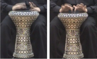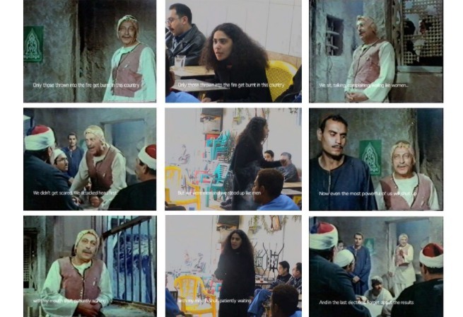 LEFT IMAGE – Tabla, ( Venice Biennale Venice, Italy. 2003 ) is inspired by the saying, empty vessels give a louder sound, which is illustrated in the Kalila Wa D/mna*story: The Fox and The Drum. – A fox hears a strange and very loud sound coming from a drum hanging on a tree. The branches of the tree, moved by the wind, hit the drum and make that noise. Amazed by the size of the drum and the power of the sound, the fox jumps on the drum thinking that it would be as full of flesh, as it is big and loud. The drum falls, breaks; it is empty and fragile. Disappointed, the fox then realises that the lowest, ugliest and shallowest of things are precisely those that make the loudest sounds… Tabla is composed of a video of a beautiful encrusted tabla held by a tabla player of whom you can only see the hands. The percussionist holds the instrument between his legs in a very sensual way, as if holding a woman's body. He plays different rhythms, expressing different moods and emotions; anger, love, war, spirituality, …. In front of the screen, on the floor, hundreds of raw Nile-mud tablas of different sizes, are randomly disposed.