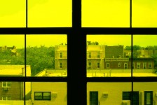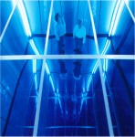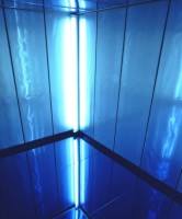 IMAGE DESCRIPTION : 1, 2 , 4 and 5 from INDEFINITE BLUE, installlation inside elevator, 2003 - 04 at The Queens Museum of Art, NY. Blue plexi mirror, lexan, fluoresent lights, 15 ft 8 in x 11 ft 2 in x 8ft 7 in. -- Image 3 and 6 from TRANSMISSION 82.4, 2003 at Buzzer 30, Astoria, NY, LEE filter #100, spring yellow, silicone.