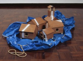 This exhibition brings together works in a variety of different visual languages that present homes, buildings and monuments from different times and locations. Tower and Wall (1937 prefabs), 2004 and Emanuel (1972 Settlement Offensive), 2005 present different architectural models that recreate homes built at two key moments in Israel�s history. Tower and Wall is a group of five single storey buildings, erected during the settlement of Palestine by the Israelis during the 1930s. Like the buildings they are based on, these models were built in a day. Coley sites them on a blue tarpaulin with a ten-metre rope, giving the models positioning a sense of impermanence.