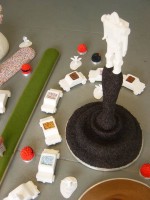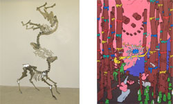 He uses drawings, paintings, sculpture, and video to transcribe small details from his memory into a whimsical aesthetic. His work mixes his absurd and sophisticated wit, with a subtle melancholy of memorial, but is executed with a touch of both the simplicity and cruelty of a child�s eye. - He assembles casts of taxidermist animals or toy train tracks into sculptures and structures that seem as though they are just about to topple over. The rigid materiality of household objects is transformed into illogical fantasies whose architecture is supple enough to allow the most unfathomable realities to seem at ease. - Touron is represented by SlingShot Project Gallery NY.