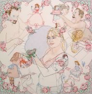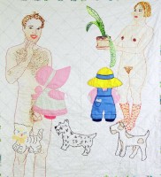 The portrait Cogan offers of life as a �bachelor girl� looks like loads of fun. There's nothing in here about paying the rent or even getting dressed. The world she shows us is one of pleasure and self-absorption with occasional drop in visits from like-minded nude males. When she's not eating or playing suggestive games with hand puppets, Cogan's bachelor girl lounges around talking on her cell phone and hugging her cat. And she stays voluptuous and pretty, no matter how many Hostess cupcakes and Pop Tarts she eats. What a life. The character Cogan creates is sort of a 21st-century female Hugh Hefner in much scantier pajamas. The trick here is that she's Playboy centerfold and playgirl all at once. She gets to keep her cake and eat it too. All this would just be propaganda for a point of view no one seriously disagrees with anymore except that Cogan's rendering is so appealing and so deftly integrated with the vintage fabrics she uses that the effect ends up being more than just the sum of its parts. The works are both decorative and witty. The embroideries are fairly primitive, made of neat basting stitches that clearly draw her subjects but without any of the subtlety of the originals that earlier generations of women sweated over with cramped fingers.