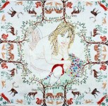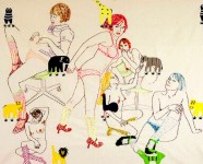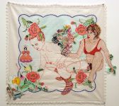 BACHELOR GIRL - ORLY COGAN at Julia Friedman Gallery - Nudes on vintage fabrics provide witty contrast. - To paraphrase an old song, Orly Cogan enjoys being a girl, and her embroidered nudes offer a flip, hip irreverent take on the conventions of femininity. She achieves her signature look by stitching figures on dainty vintage fabrics. These found linens, which once served as table runners, bureau scarves and tablecloths in a more modest age, were already embroidered once by an earlier and more circumscribed generation of women. Cogan adds to these quaint decorations a layer of attitude that updates old-fashioned womanly crafts with a kind of happy-go-lucky postmodern perversity.