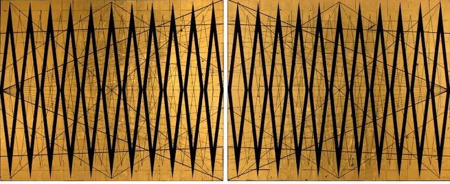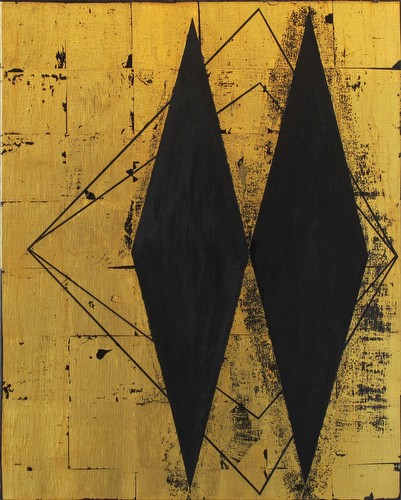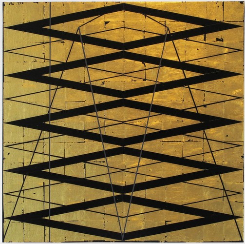 Pablo Griss’s strongly expressionist work, had figurative origins that evolved into a distinctive abstract style. In 2010 Griss launched his series ¨Flatline¨ which signaled an adapted style to address the geometric exploration of space. Currently, these elements (such as rhombi and lines) are specific and recognizable. Griss relies on repetition, contrasts and symmetry in compositions where negative spaces are most important as they are seen through the objects he chooses as rendering a simple, abstract and believable space. Exploring materials ranging from raw linen, collage, paint and copper leaf Griss became fascinated with gold leaf in which he found an ever-changing background providing depth and atmosphere to simple, abstract, geometric investigation where order is only apparent.