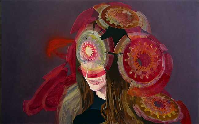 Since then Johnson has removed the laminate surface from his work. What are shown are the intricately detailed constructions of collages using a technique interlocking fragments of individually hand-coloured paper. His subjects - portraits and disused spaces - are recovered old newspapers and magazines; a particular source of Johnson's imagery is old skateboard and speedway magazines. Found in the work, also, are a number of recurring motifs: esoteric badges, logos, marks of symbolism and orb-like discs. These crop up as pictorial, structural devices within the logic of the depiction and also as signnifiers of other-worldly attributes and belief systems. He uses them, also, to create an idea of family resemblances and reinforces the notion of the family hewn from the show title 'The Glass Family'.