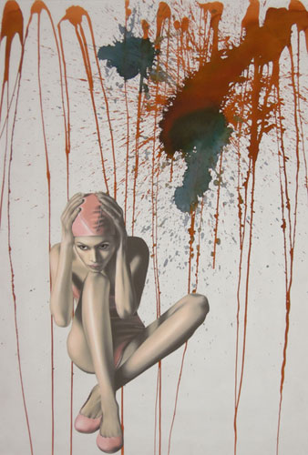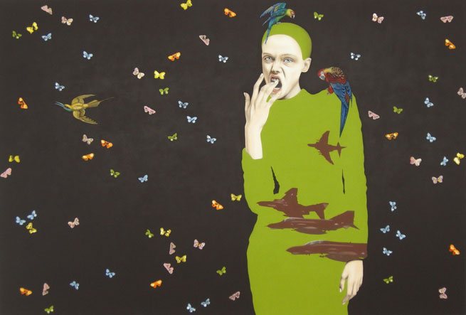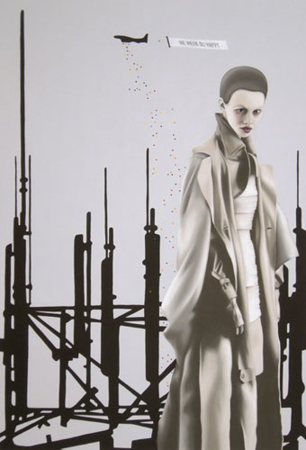 Other elements, too, originate from the collective pictorial memory, though from other sources. Pictures like those of a tank, a high-rise apartment building, a globe, or a burning human are not mere amendments, narrative anecdotes, or attachments to the actual paintings. These visual themes become dynamic counterparts of the women, and, as such, at times undermine and question the original function of depicting beauty. Fashion itself is familiar with shock elements and the transformation and integration of violence. Military clothing, for instance, was one of the most important sources of inspiration for the fashion art of the 20th century. Camouflage patterns adorn not only warships and tanks but embellish t-shirts and wallpaper. The question whether this transference charges the design with an aggressive moment or, rather, softens the design of power, remains unanswered.