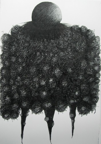 The forms/marks which have evolved from working with the materials in this intuitive way, at first glance, give the work a familiar appearance (possibly animal, human or letters).