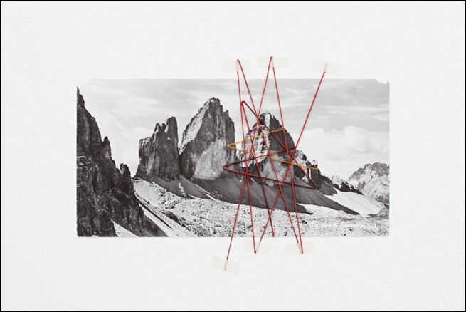 In celebrating the notion of both an idea and a chosen medium transcending itself, L’Entrée des Groites, 2010, is a work that seems to perfectly encapsulate this aspiration. A monochrome postcard of three men outside the entrance of a cave has been overlaid in part by a deep red acrylic paint. For the artist this work, as a consequence of its appropriation, has the power to be simultaneously sculptural, filmic and painterly. Other works appear to take their lead from this approach to making. Large-scale floor based paper works operate like spacial drawings with fine lines of thread, glass spheres and foam balls accentuating gestures that allude to both landscape and human forms. These works play with an aesthetic that again challenges the viewer to consider inherent material qualities and their subversion.