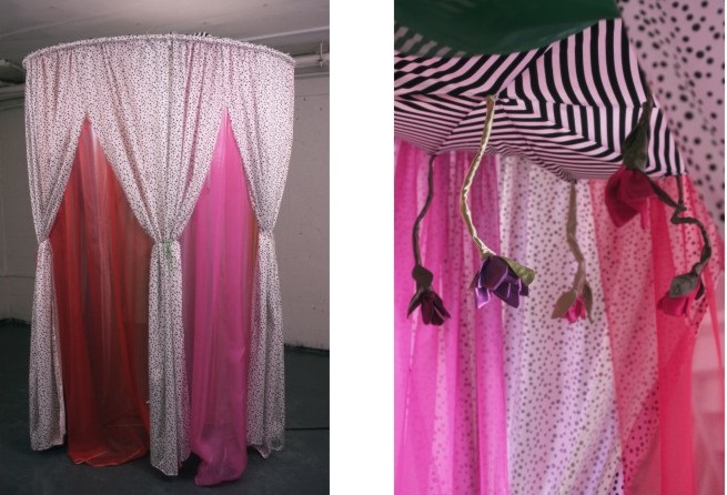Inherent in Taleen Berberian�s sculpture and installations is a stylized notion of femininity that re-integrates traditional elements in unorthodox ways. She combines materials with sexual connotations, influenced by fashion design and surrealism, resulting in a playful interpretation of archetypal forms. Taleen constructs ethereal installations capturing the essence of womens' crafts to encase, enlarge, and permeate personal boundaries with a submissive and unruly imagination. Suspended or site-specific installations are translucent and textural surroundings from which gender is palpable. Within soft spaces of fabric and mixed mediums, sculpture and environment converge producing canopied theatrical settings where viewers are the actors and audience. |