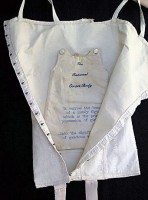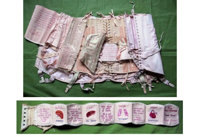 Through all of this, I developed a sensitivity to �correction� and the need to fit in. The stitched stories on these corsets are from a variety of sources. I have incorporated text from the behavioral manuals of various historical periods, which describe prescriptions of public and private deportment, as well as personal narratives of modern women who have lived with these physical constraints. These same texts and relationships inform my corset books as I create a resonance with the rules and perceptions, which have been confining and defining women�s postures. These projects express my feelings about with using voluntary �restraint� to comment on the involuntary restraint that I experienced. My books are a continuation of my expressions and pay homage to understructures, which have voluntarily or involuntarily supported and corrected women.