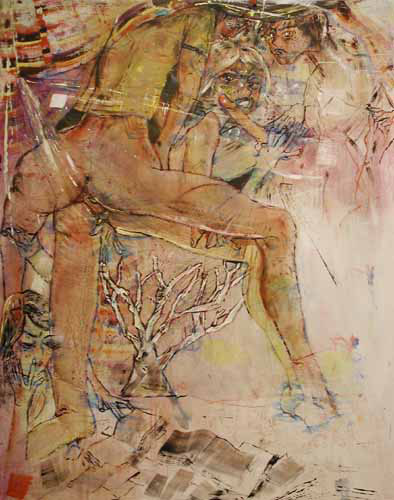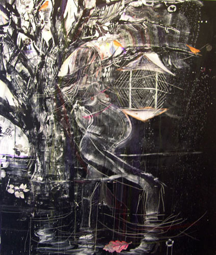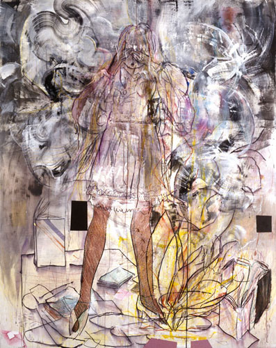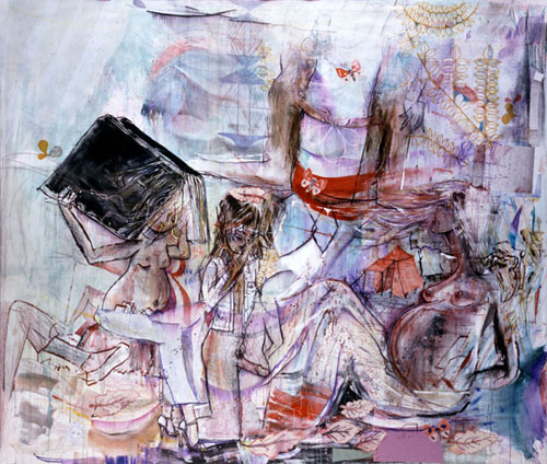 On the one hand, the artist is extending the monster wing of Bad Painting somewhat in the vein of Jason Fox, only juicier. In ''3rd Plateau Eye Camera,'' boys don hoary masks to view a giant geometric structure that hovers like a vision, or a total eclipse of representation, above the ocean. On the other, he increases the ever-expanding race of doe-eyed teenage girls introduced in the early 1990's by Rita Ackerman, crossing high-school-notebook doodling with Seventeen magazine fashion illustration. In ''Jin and Snowball (seasick)'' four girls, so golden they seem almost jaundiced, whose stylish attire includes a bright, insistently detailed knitted poncho, share a little hollow with two white dogs. ''Shiiba Linu'' features another dog in a field of dense yellow-green grass; it sits between a beautifully painted electric keyboard and a kitten's mangled carcass, as if awaiting its next command.
