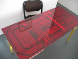 TOM ELLIS, MOT, London, June 22 - July 21 2007 Tom Ellis invites us to take a walk up Klever Strasse where the architect appears to be a lazy drunken clown, with abandoned paintings, slacker expletives and a Berlin beer table. Even the Gallery has had its name inverted to become the artist. But then we are given glimpses of sharp wit and skilled craftsmanship when we realise that the artist has also designed the office furniture, a resplendent red glass table that spells out the word GONER, a prediction perhaps for the gallerist or curator that sits behind it? |