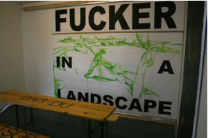 But before you can slap yourself knowingly on the back, we�re back to dumb with a hastily painted self-portrait on a scrappy piece of sheet timber, which itself has been attached to sliding door mechanisms allowing the work to literally travel across the wall like some collapsing clown car. As we enter the main space, what appears, at first, to be a bizarre grouping of pseudo-modernist paintings, soon turn out to be the slacker musings of Ellis as he mixes purposefully dumb sentence construction with deconstructions of Picasso and Goya. These are again on sliders that turn the oversized paintings into doors or give them the option of somewhere to go, but too little room to move. This sounds like a clumsy metaphor for the many dead ends of painting, but in Klever Strasse, dumb is Klever, and if you are in any doubt as to how to wear your hang ups, Ellis has installed a German Beer Tisch for the audience to sit and contemplate, Tr�s Pass�, Fucker in a Landscape, The Lazy Thieving Cunt and of course, Fuck It.