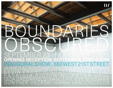 Haunch of Venison is delighted to present ‘Boundaries Obscured’ from 23 September to 5 November 2011, a group exhibition that will mark the gallery’s inaugural exhibition in its new Chelsea location at 550 West 21st Street. The show will feature new works by artists including Ahmed Alsoudani, Jake and Dinos Chapman, Kevin Francis Gray, Isca Greenfield-Sanders, Jitish Kallat, Patricia Piccinini, Peter Saul, Eve Sussman and Simon Lee, Gunther Uecker and Joana Vasconcelos. Several of the aforementioned artists will also have solo shows in the new space over the next year.