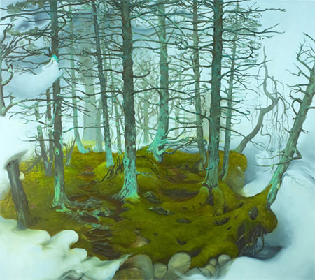 INKA ESSENHIGH The Old New Age January 23 - February 20 2010 reception: Saturday, January 23 6-8pm 303 Gallery is pleased to present our third exhibition of new paintings by Inka Essenhigh. The artist�s latest body of work touches on notions proffered by 18th century Romanticist William Blake, who wrote, �Imagination is the real and eternal world of which this vegetable universe is but a faint shadow.� The ostensible subject of the paintings is landscape, the natural world. The paintings� lush backdrops (most directly drawn from her studio in coastal Maine) are rendered almost 3-dimensionally, bathed in a celestial light that gives the scenarios a hazy, hypnagogic quality. Yet the work is imbued with a sense of the hidden spirits revealed by profound communion with one�s surroundings. Anthropomorphic figures drift in and out of perception, as Essenhigh creates visionary epsiodes of realization and engagement with the spirit world. In �Green Goddess,� a chimerical female figure swathed in forest flora rises out of the ground, with an impetuous smile that beckons the viewer into her nether world. Her appendages double back into the forest, wispy clouds that form one of many trails into the beyond. In �Lower East Side,� Essenhigh envisions her New York street as a mythical cornucopia of figures, with street denizens magnetically pulled into a hallucinatory street cave, awash in pink light. The pallid glow of the street implies the aftermath of an ambiguous catastrophe with all the uncertainty and desperation that come with it. Two young girls observe the scene, one perched on a fire escape above and the other on her way home from an errand, both floating through their mysterious world. Essenhigh�s landscapes are without a defined time or place, yet through their perceptual qualities they elucidate the artist�s unique metaphysical universe. Inka Essenhigh was recently included �Comic Abstraction� at the Museum of Modern Art, New York; �Imagination Becomes Reality�, Museum F�r Neue kunst, Karlsruhe, Germany; and �Counterparts: Contemporary Painters and Their Influences�, Contemporary Art Center of Virginia. In 2005, Essenhigh had a solo exhibition at the Salamanca Cuidad de Cultura Fundaci�n Municipal, in Salamanca, Spain, with a catalogue including a text by Laura Hoptman. The artist has also had one-person exhibitions at Sint- Luks Galerie, Brussels, Belgium, The Museum of Contemporary Art, Miami, FL, as well as at the Fruitmarket Gallery in Edinburgh, Scotland. In 2004, Essenhigh was included in the Biennial de Sao Paulo, Brazil, as well as the SITE Santa Fe Biennial, Santa Fe, New Mexico. 303 Gallery represents the work of Doug Aitken, Laylah Ali, Valentin Carron, Anne Chu, Thomas Demand, Inka Essenhigh, Hans-Peter Feldmann, Ceal Floyer, Karel Funk, Maureen Gallace, Tim Gardner, Rodney Graham, Mary Heilmann, Jeppe Hein, Karen Kilimnik, Florian Maier-Aichen, Nick Mauss, Mike Nelson, Kristin Oppenheim, Djordje Ozbolt, Eva Rothschild, Collier Schorr, Stephen Shore, and Jane and Louise Wilson. 303 Gallery is open Tuesday-Saturday from 10 am - 6 pm. For further information please visit us at www.303gallery.com or contact Lisa Spellman, Mari Spirito or Barbara Corti. |