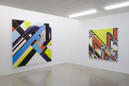 Sarah Morris Personal Best May 13 - June 25 Air de Paris is delighted to present the new solo exhibition by Sarah MORRIS, the third by this internationally recognised artist at Air de Paris. The exhibition title Personal Best is a reference to the 1986 movie written by Robert Towne, to whom Sarah Morris devoted a film in 2006. She has used the film poster as the support for one of the drawings in the exhibition. In this exhibition Sarah MORRIS is presenting paintings and drawings from her last series, Knots and Clips and John Hancock. In Knots and Clips she has turned to simple office items and their capacity to symbolise such demanding mental operations as establishing connections, liaising and unifying. Devoid of all function, these purely combinatory forms are used to generate intricate motifs in which � despite the pictures' quasi-analytical clarity � form and content are indistinguishable and the colour orchestration heightens the overall complexity. These simple binding structures suggest a transition from enduring utility to contingent organization or text, data and copied material. A painting from her very last series John Hancock is also presented. Using as a starting point the iconic 1967 Skidmore, Owings and Merrill building, called the John Hancock Center, Morris uses forms reminiscent of the structure of the first multi-use high rise building in America, named for John Hancock Mutual Life Insurance company, a developer and original tenant of the building. The painting also play with the history of John Hancock as the �father of the signature� and the corporatization of Hancock�s signature for Mutual Life. Morris parallels and streamlines the corporatization of Hancock�s signature using her own initials in the new work, invoking a long history of not only industrial design, but also the role of the signature in relation to its confirmation of ownership, agreement to act and validation of artistic work. Morris's paintings create a form that is continuously splintering and self-generating, and without resolution, creating after-images of capitalism and pre-images of new systems of control. Morris's project, which spans both painting and film, creates a new level of discourse - playing simultaneously architecture, industrial design, entertainment, commerce and politics. Morris portrays, with beguiling perfection, bureaucratic structures of control and networks and the attempt to mask their own power. The infiltration and use of these mainstream forms and the creation of systems of interpretation that are ambivalent and even possibly contradictory is achieved by engaging and investigating moments of failure toward its use and avoidance. The exhibition will also feature Morris�s film "Points on a Line" (2010). The Farnsworth House, Plano, Illinois and the Glass House, New Canaan, Connecticut. Philip Johnson and Mies van der Rohe. Curator and architect. Architect and architect. The film documents a shared desire to build structures that might change the way we think about a house, a form and a context. These two buildings were the result of shared ideas and collective desire. But they also complicate ideas of the copy and the original and the chronologies of Modernism. Scrutinising the surface effects their misleading transparency pretends to deny them, Morris turns today's tediously conventional exercises in critical reassessment of the history of modernism into an icily hypnotic visual contemplation free of any apogee. The same is true of Liam Gillick's sound track: pure flux, precise focus on points of detail without losing sight of the line they form, as signalled by the Kandinsky-sounding title. By carefully documenting the daily maintenance of these two buildings and lingering over the precise placement of the structures in space and of objects within each structure, we are presented with a clear view of places that have gone beyond their initial modest use and become the intersection of a dialogue that was both personal and professional. Morris filmed at both sites over the course of several months, among other locations including The Four Seasons Restaurants, the Seagram Building, Mies van der Rohe's infamous Lake Shore Drive, and Chicago's Newberry Library. Morris utilizes The Four Seasons, a place that Philip Johnson practically used as his personal office, as the meeting point between the two architects. Morris�s film is both a record of preservation of two structures and a document of power plays that left a mark in the pragmatic idealism of the late modern period. Born in 1967, Sarah Morris lives in London and New York. She attended Brown University, Cambridge University, and the Whitney Museum of American Art�s Independent Study Program. From 1999-2000 she was an American Academy Award, Berlin Prize Fellow and in 2001 Morris received the prestigious Joan Mitchell Foundation Painting Award. She has widely exhibited internationally, with solo exhibitions including the Museum f�r Moderne Kunst, Frankfurt (2009), Museo d'Arte Moderna, Bologna (2009), Fondation Beyeler, Riehen/Basel (2008), the Museum Boijmans van Beuningen, Rotterdam (2006), Moderna Museet, Stockholm (2005), Palais de Tokyo, Paris (2005), Kestner Gesellschaft, Hannover (2005), Kunstforeningen, Copenhagen (2004), Miami MOCA (2002), Hirshhorn Museum, Washington D.C. (2002), and Nationalgalerie im Hamburger Bahnhof, Berlin (2001). She realized two permanent site�specific artworks in 2010 at the Gateway School of Science in Queens with the architectural firm Pei Cobb Freed and Partners and �Hornet� at K20 Kunstsammlung Nordrhein�Westfalen Museum in D�sseldorf, Germany, which opened in July 2010. She will be realizing two large scale permanent site-specific projects at the Gulating Court House in Bergen, Norway and at the Edward Durell Stone designed Tulsa Convention Center, in Tulsa, Oklahoma in 2011. Sarah Morris Personal Best 13 mai � 25 juin Air de Paris a le plaisir de pr