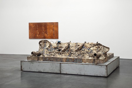 Sterling Ruby/Lucio Fontana September 10 - October 22, 2011 Opening reception: Friday, September 9, 2011 6:00-8:00pm Andrea Rosen Gallery is delighted to present a two-part exhibition intertwining the work of Sterling Ruby and Lucio Fontana. The show is both extraordinarily elegant and at the same time violent and disruptive. The works for the exhibition have been very specifically chosen both to inspire the audience to see each artist in a new light; and to accentuate in each artist's work how the specificity of the materials used alter the making as well as the content. The juxtapositions are both overt: the second part of the exhibition concentrates on Fontana ceramics and Ruby ceramics; and more subtle: the first two rooms of the exhibition intertwine bronze works by both artists, each of which shares a rare ability to simultaneously expose the significance of both the material from which the work was molded, with equal emphasis on the intrinsic nature of bronze as essential to the work's perception. The first two spaces also contain wall bound works by both artists. Fontana is represented by three extremely significant copper works from 1962 that so viscerally expose how the material dictates the nature of the slash. In seeing these works, one immediately re-orients themselves to Fontana's process. As artists become more historically significant there seems to be a strange reversal; we tend to condense our notion of their significance into one particular idea. These copper works re-open our eyes not only to their aggression but to the fact that these works are landscapes, portraits of skyscrapers, and remnants of the artist's action, which is exactly what ties these two artists together. So much of Ruby's work is about the remnants of what seems to be destroyed or the remnants of one act manifesting into a wholly new form. In Ruby's work there is a fluidity that becomes truncated and frozen. As significant as process is in both of their works, there is a potential assumption that the artists were dictated by the process, but what also ties these artists together is their sophistication; to be able to simultaneously make physical process decisions and make very specific aesthetic decisions. So while there is a deep interest in the nature of the material, and the limitation of the material, and the creation and destruction of the material, there is also an overriding ability to control amazing aesthetic determinations. Where for instance the "EXHM" [Exhumation] collages by Ruby appear to be remnants of debris from other bodies of work, and there is no sign of where controlled intervention overlaps with found material, it's evident that both are clearly present. While there is a presence of ceramics in the two front rooms, one piece by each artist beginning to create these further links and connections, the third space is entirely dedicated to this relationship. In choosing the Fontana ceramics, each was carefully selected for its earthy color tones, clarity of its gesture and how while all his ceramic works are figurative in nature, these were chosen for their ability to transform into abstraction. The ceramics are some of the most exploratory and fundamental works for both artists and share a sense of aggression in their loose, raw forms. Ruby's ceramics create their own history. Fontana relished the immediacy and fluidity of clay, which he studied during his education in the late 1930s at the Sèvres factory, a manufacturer of high-end porcelain for the French royals. These daring ceramics were often described for their raw nature of clay that was still attached to a slab of earth, (like the figures wrestling free from the ceramic slab in Corrida, 1950-1955) and were self-described as embodying the energy of a "motionless earthquake." For Ruby, the "Basin Theology" ceramics are both hot and cold, psychological and sensual, yet coolly abstract at the same time. Each piece is made of recycled fragments of earlier destroyed or damaged works that are layer by layer, by repeated kiln firing, re-integrated through that allegory. Each piece is then fired up to ten times and can spend days at a time in the kiln. While basins are traditionally man-made or natural containers for water, Ruby's basins seem more like the charred, fossilized remains from an unknown archaeological site, but through their colors and amorphous terrain seem also alive and hyper-sexualized. As Ruby explains; I am smashing all of my previous attempts, and futile, contemporary gestures, and placing them into a mortar, and grinding them down with a blunt pestle. I am doing this as a way of releasing certain guilt. If I put all of these remnants into a basin, and it gets taken away from me, then I am no longer responsible for all my misdirected efforts. I will no longer have to be burdened with the heaviness of this realization (From the essay "American Perspectives" by Sterling Ruby. Permanent Mimesis: An Exhibition about Simulation and Realism. (exhibition catalogue). Italy: Electa Mondadori, 2010) Ruby's description goes far to illuminate his own central work of the exhibition the bronze, "EXCAVATOR DIG SITE." Much of the joy of discovery in this work is found hidden in interior "in-between" spaces, in the cracks and crevices, and the scattered attempt to identify and piece together individual parts. This central idea seems to be the key to the exhibition. Sterling Ruby (b. 1972 in Bitburg Germany) lives and works Los Angeles, CA. His solo museum exhibitions include "Supermax," Museum of Contemporary Art, Los Angeles (2008), "CHRON," Drawing Center, New York (2008) and Grid Ripper, Galleria d'Arte Moderna e Contemporanea, Bergamo (2008-2009). His work has been included in group exhibitions such as "New Photography," the Museum of Modern Art, New York (2009), "Dirt on Delight," Institute of Contemporary Art, Philadelphia and the Walker Art Center, Minneapolis (2009), and the Moscow Biennial (2007). Sterling studied at t