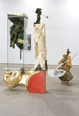 Matthew Monahan October 10 � November 15, 2008 September 17, 2008, New York�For his fourth solo show at Anton Kern Gallery, Los Angeles-based artist Matthew Monahan assembled a group of fragmented figurative sculptures filled with mystery, boldness, and grace. Monahan combines glass, foam, honeycomb mesh, and treated paper in a manner that, at times, these elements are lifted off the ground, ostensibly defying the laws of gravity and hovering weightlessly in space. Monahan has closed the ancient door to the curiosity cabinet that has so inspired his earlier work, and has left for the open field of large-scale sculpture. The former multitude of displays containing deranged varieties of wax figures, paper sculptures, ornamental drawings, and other artifacts, has given way to larger dimensions and bold gestures, to a monumental language of direct physicality, erupting emotions, and barely constrained potency. The sense of mystery, however, of the early Wunderkammer remains. One can feel the sculpturesʼ physical tension and their urgent need to crack the boundaries imposed by the artistʼs sculpting knife and the industrial materials. The figures are captured in the moment of breaking through these constraints and becoming re-animated. Their metal-leaf covered faces shimmer in the light. The work oscillates between the material and immaterial, between the abstract and allegorical, the light and heavy-weight, the sharply cut and gracefully modeled. They are monuments of historical and cultural bewilderment, existing in a realm where science-fiction, classicism, Buddha and modernism coexist. Monahanʼs work has recently been presented in the 55th Carnegie International, Pittsburgh, the Sonsbeek Sculpture Exhibition, Arnhem (both 2008), the Hammer Museum, Unmonumental at the New Museum, USA Today at the Royal Academy, London (all 2007), as well as the Berlin Biennale and the Whitney Biennale (both 2006). Recent one-person shows include exhibitions at the Los Angeles Museum of Contemporary Art and the Douglas Hyde Gallery, Dublin (both 2007). The exhibition will open on Friday, October 10 and will run through Saturday, November 15, 2008. The gallery is open Tuesday through Saturday, 10 am - 6 pm. For further information and images, please contact Christoph Gerozissis or Michael Clifton at (t) 212.367.9663, (f) 212.367.8135 or email: [email protected]. |