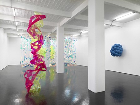 Berta Fischer 2. März – 19. April 2013 Ausstellungseröffnung: Fr, 1. März, 18–21 Uhr Öffnungszeiten: Di–Sa, 11–18 Uhr Die Galerie Barbara Weiss freut sich die erste Ausstellung mit neuen raumgreifenden Skulpturen der in Berlin lebenden Künstlerin Berta Fischer zu präsentieren. Berta Fischer greift mit ihren Werken massiv in die Raumstruktur der Galerie ein. In der Gesamtheit der überwiegend aus Acrylglas gefertigten farbenprächtigen Skulpturen entsteht ein Irrgarten, der seine Besucher staunen lässt. Dabei treten die Werke nicht nur mit der Architektur in Kontakt, sondern nehmen durch ihre Präsenz sehr gezielt Raum in Beschlag: spinnenhaft ungelenk begrüßt einen ein vielgliedriges Wesen am Eingang, grün und rot ineinander verschlungen schraubt sich eine Säule vom Boden zur Decke während aus der Wand dicke blaue Kugeln zu einem Geschwür oder einer Frucht zusammen zu wachsen scheinen. Ein in metallischen Blau-und Rottönen changierender Vorhang teilt den Ausstellungsraum und setzt in seiner Transparenz genügend Blick frei auf die dahinterliegende in schrillem Grün strahlende Rosette. Einem lauernden Tier gleich sitzt sie auf der Wand und guckt im ersten Moment prominent durch den Vorhang hindurch, um sich im nächsten Moment dahinter zu verstecken. Sogar der Galerieschreibtisch wird plötzlich von einer zarten grün-orangenen Wand in ein Séparée gerückt. Die Paarung aus der Souveränität, mit der die Skulpturen ihren Raum definieren und ihr stetiges Herantasten an das Fragile zeichnet Berta Fischers Werk aus. Seit über zehn Jahren arbeitet die Künstlerin mit verschiedenen Kunststoffen. Häufig fordert sie sich dabei selbst an die Grenze der Stabilität. Ihr Werk lädt ein, Bezüge zu Georges Vantongerloo oder László Moholy-Nagy zu ziehen und konfrontiert sich auf unterschiedlichen Wegen mit dem Dialog aus künstlicher und natürlicher Form. Dass es Berta Fischer auch in ihren neuen Werken gelingt, starre Materialien in ein organisches Formenvokabular aufzulösen, zeigt nicht allein die Monumentalität und Leichtigkeit der Skulpturen. Ihre Wände, haben mit Löchern und Mustern begonnen und sich mittlerweile in lang geschlitzte und dynamisch bewegte Objekte entwickelt. Der Polyurethanschaum ist als Material neu hinzugekommen und gewinnt in seiner Masse an Weichheit und Sensibilität. Eine Skulptur, deren lange Knetfinger aus der Wand ragen, gibt Aufschluss darüber in welche Richtung sich die Materialität der Werke in Zukunft weiterentwickeln könnte. - Kirsten Wandschneider Berta Fischer March 2 – April 19, 2013 Opening: Fr, March 1, 6–9 pm Opening hours: Tue–Sat, 11 am–6 pm Galerie Barbara Weiss is very pleased to present the first solo exhibition by berlin-based artist Berta Fischer with a series of new voluminous sculptures. Berta Fischer redefines the gallery space with her works. A maze of colourful acrylic sculptures take over the gallery space leaving the visitor in marvel. The works do not simply enter a dialogue with the architectural space, but through their presence they take ownership of it: at the entrance a spiderlike creature welcomes and gives way to a red and green interwoven column reaching from floor to ceiling; from the wall on the right a thick blue boulder-like form emerges resembling an ulcer or even a berry. A blue and red metallic-coloured, oscillating curtain separates the exhibition space while leaving (through its transparency) a view onto a neon green rosette mounted on the back wall. Its gaze resembles the furtive look of a lurking animal that hides behind the curtains. This leaves only the gallery front desk that is now enclosed by a tenuous green-orange wall. The interplay between the sovereignty with which her sculptures define the space and the constant sense of fragility and tension that accompany them, is characteristic to the artist's practice. For over ten years, she has been working with different synthetic materials and has pushed these to the limit of their stability. Comparisons could be drawn to artists such as Georges Vantongerloo or even Moholy-Nagy, but most importantly her works are immersed in the differing ways in which a dialogue between natural and artificial forms could be held. In her most recent works that are characterised by their monumentality as well as their simplicity, Berta Fischer shows once more her ability to change rigid materials into an organic form-vocabulary. Her walls, which initially began with holes and oval patterns, have now developed into long, slotted and dynamic objects. The PV-foam (Polyurethane) is a new material, which has gained through its bulging components sensibility and softness. Further, a long plasticine sculpture that emerges like long fingers out of the wall, gives way to possible directions that the artist might of move on to. - Kirsten Wandschneider |