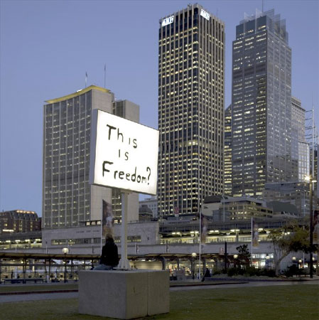 Sam Durant This Is Freedom? April 11 � May 16, 2009 Opening reception: Saturday, April 11th, 6 � 8 pm Blum & Poe is pleased to announce This Is Freedom?, an exhibition of recent work by Los Angeles based artist Sam Durant. This exhibition will present a new body of Durant�s light box signs and drawings. Looping back on one another, the drawings serve as personalized indexes for the light boxes by illustrating their origins in archive photographs from Aboriginal civil rights protests in Australia and African American and Native American civil rights protests in the United States. The light boxes recontextualize the handmade protest signs found in the photos into the glowing language of commercial signage, their impassioned words now super-sized and immortalized, albeit codified. Durant often investigates social, historical, and political issues through sculpture, installation, photography, and drawing. He incorporates text and language that is imbued with these histories to find how the meaning is constructed and understood in society. These new signs were originally exhibited at the Sydney Biennial last year and expand on his previous signs, which drew from American civil rights demonstrations. This body highlights the parallels between US and Australian history with their shared colonial past and their oppressed Indigenous populations, and ultimately explores how historical moments can be reinstated, not only positioning one to reflect on the past, but to also to provoke a reinterpretation, and to consider the relevance in the present. Sam Durant was born in Seattle, and lives and works in Los Angeles. Durant has had several one-person exhibitions, a selection of institutions include the Museum of Contemporary Art, Los Angeles; the Kunstverein D�sseldorf; the Walker Art Center, Minneapolis, MN; and the Wadsworth Atheneum Museum of Art, Hartford, CT. His work has been included in such group exhibitions as the California Biennial at the Orange County Museum of Art, California (2008); Biennale of Sydney, Sydney, Australia (2008); 8 Bienal de Arte de Panam�, 8th Panama Biennial, Panama (2008); Freedom at the Hague Sculpture Center in the Netherlands (2008); Unmonumental at the New Museum, New York (2007); the 2004 Whitney Museum of American Art Biennial, New York; and the 2002 Venice Biennale, Italy. This Is Freedom? marks Durant�s eighth solo exhibition at Blum & Poe. |