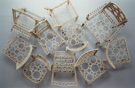 Espace �ponge - Schwamm oder der por�se Raum 2008, Installation mit rund 10 perforierten Holzst�hlen, einzeln erh�ltlich |