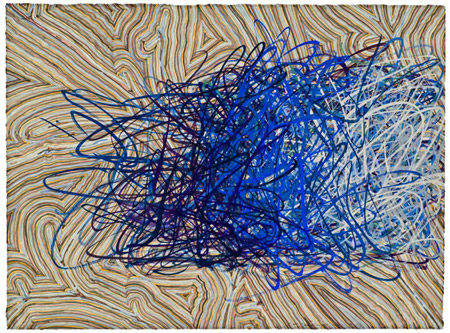 SAM REVELES - SEEDBED JAN 5 - FEB 9, 2008 Opening Reception: Jan 5, 6 - 8pm In a new body of work by Sam Reveles there emerges from the tilled backgrounds of his paintings and works on paper a gestural conjuring that fosters something not unlike the natural imperative of a biological organism hoping to expand and thrive through cycled replication and explosive movement. The delicate and meditative groundwork that Reveles lays down on the surface is comprised of carefully tended concentric or radiating outlines that have their origins in various forms taken from nature; the shadow of a twig or the silhouette of a small woodland creature. These patterns, culled from moments or objects that Reveles has collected over time, are a means of organizing the vast and infinite space of the canvas and paper, a way of aerating it for the gestural mark to take root. What becomes something like an organic matrix, like the plowed lines of topsoil across fertile farmland, is the constrained foundation or cultivated seedbed made ready for the outgrowth of what Reveles knows best.. The subject of man�s relationship with nature is at the heart of this body of work. The ongoing struggle to survive off the land with a varied relationship to the landscape made tenable through agriculture is a subject that Reveles knows something about, having grown up in El Paso, Texas. The land surrounding the Rio Grande Valley holds a particular significance in this regard; an arid place that without irrigation would never sustain a crop to harvest; something the indigenous peoples, with which Reveles shares his ancestry, had been doing in the region for many centuries before the first Spanish missionary had set foot there. Like the artist in the arena of the formal tradition, so too the lone farmer in the field must find a working harmony between himself and the field. Such a delicate balance is this, that so easily it can be tipped in either direction; the fragile seedlings of the artist�s motive overtaken by the weight of their medium or the once arable soil of the open plane overworked until depletion. Reveles sees that balance as integral to his process; that the force of his imposition on the painted image is always met with an equal force that resists it and it is from this energy and dialogue that comes the evidenced beauty of the artist�s desire to understand his own place in the landscape. |
