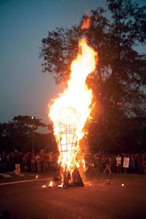Live True Life or Die Trying Naeem Mohaiemen Curated by DJ Spooky September 10 - October 31, 2009 Opening reception, Thursday, September 10, 6-8pm Discussion, Thursday, September 17th, 7 pm Mohaiemen in conversation with Vijay Prashad, author of Darker Nations: A People's History Of The Third World and Everybody Was Kung Fu Fighting: Afro-Asian Connections and the Myth of Cultural Purity. Related projects - http://shobak.org Informed by two Chris Marker films that are decades apart in political exhaustion, Grin Without A Cat (grand disillusion with interlinked global left revolutions) and Case of the Grinning Cat (anti-war movement with foretold conclusion), Naeem applies these polarities to political movements that he participates in or documents. Looking at a single day in January 2009, he follows two political rallies that happen in two parts of Dhaka. The first by a new group of young Islamists-- an event where he finds no familiar faces, "except among the photographers". Yet he also notes the energy: "These are not the Islamists we lazily lampooned in the 1980s. Now their rhetoric has a sharp edge and reality tint. When they argue that gangster capitalism has failed and is dragging down the world, that the global compact is imploding, it's a resonant message for many." The second rally, later in the afternoon, organized by a group of Leftists on the university campus. In this one, Naeem is back in his comfort zone, meeting familiar friends, joining in enthusiastically, sometimes marching and chanting, sometimes walking backwards trying to capture a "dramatic" photo. Through it all though, a queasy feeling: of the awareness that this second rally is so much smaller, of the inevitability of Left decline, of recognizing his own desire to zoom in for a close shot. The better to inflate the size of the crowd. His camera is soaked in bias and sympathy. Naeem Mohaiemen is a writer & artist working in Dhaka & New York. He uses text, video, and photography to explore historic markers in post-partition South Asia. He founded Visible Collective, whose projects http://disappearedinamerica.org looked at globally interlinked national security panic. Naeem also works on activist projects in Bangladesh. He writes the chapter on religious and ethnic minorities in the Ain Salish Kendro Annual Human Rights report http://askbd.org, as well as being a member of local activist networks http://unheardvoice.net/blog. Working between two countries, this work delineates the contradictions between Bengalis in marginal migrant status in Northern countries, and majoritarian (and authoritarian) status inside Bangladesh. His essays include Collectives in Atomised Time (with Doug Ashford, Idensitat), Fear of a Muslim Planet: Islamic Roots of Hip-Hop (Sound Unbound, DJ Spooky ed., MIT Press; runner-up for Villem Flusser Theory Award), Mujtoba Ali: Amphibian Man (The Rest of Now, Rana Dasgupta ed., Manifesta 7, Trentino), Everybody Wants To Be Singapore (The Good Life, Carlos Motta, Art in General), Adman Blues Become Artist Liberation (Indian Highway, Hans Ulrich Obrist & Julia Peyton-Jones, Serpentine Gallery), Beirut: Illusion of a Silver Porsche (Men of Global South, Adam Jones ed., Zed Books), and Why Mahmud Can't be a Pilot (Nobody Passes, Matt Bernstein ed., Seal Press), etc. Live True Life or Die Trying at Cue Art Foundation is Naeem's first solo show in America. Supported in part by Rhizome, Franklin Furnace and New Museum's "New Silent Series". This is part of a longer exploration of underground left movements, a Creative Capital project. Adiwit Ansathammarat Curated by Kay Rosen September 10 � October 31, 2009 Opening reception Thursday, September 10, 6:00 � 8:00pm �Adi�s feet are planted not so much in the past versus present, or Asia versus North America, but rather in a zone somewhere in between where memory, dreams and fantasy bleed together. Filtered through the fine mesh of his personal sensibility, a diary emerges in the form of painting or sculpture about loss, time, distance, and even humor.� �Kay Rosen Pangs of longing and the bleat of raw memory reverberate across the canvasses and scuptural surfaces of artist, Adiwit Ansathammarat. Born and raised in Thailand and educated in Scotland and Chicago, Ansathammarat is well versed in the painful and arduous process of leaving one�s home, culture and family. It is through these experiences that his work examines the altered emotional terrain of one�s personal relationships when physicality, comfort and proximity are removed. His paintings employ repeated abstract forms that bend, rip, tear and fall. His scuptural work, assembled with humble materials, emphasize aspects of distance, time and weight. These large canvasses, small watercolors and sculptural works form a personal narrative: a visual, abstracted confession of pains felt by the artist. She left me for L.A. (detail, above) is a large, unstretched canvas measuring 120� x 240.� The monumental surface is saturated with deep colors and covered with repetitive forms that resemble falling leaves in a pouring rain. Along the bottom of the canvas, Ansathammarat has torn away triangular shapes that emphasize the act of cutting and mirror the leaf-like forms in the canvase above. Both the repetition of the painted forms and the cutting of the canvas evokes a sense of angst � a heart beating rapidy or the pounding of a drum. They are also regimented like a calendar, not only parsing out time, but underlining it. I wish you could come home with me tonight (right) employs simple materials and shares in the formal simplicity of his two-dimensional work. Through the reptition of triangular and circular shapes, a highly abstracted human form is perceived. Within the frame of the body hangs a weighted form � a collection of conical and orb-like objects suspended from rope. The contrast of the colorful objects and the bleach-white outer surafaces of the piece draws the viewer to focus 