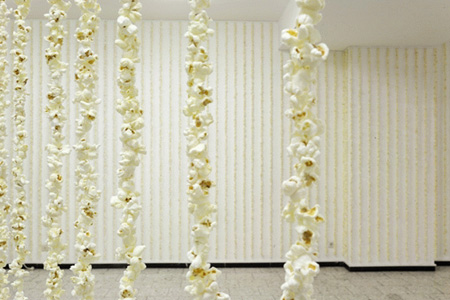 Corn Futures Some notes on a show by Mirjam Thomann at Galerie Christian Nagel, Cologne, in August 2008 by Marina Vishmidt As commodity prices soar, with a speculative boom correcting market losses incurred by the credit crash while driving a global food crisis that sees a BBC news article advising its readers to combat the isolation of poverty through the social activity of growing your own vegetables, food and futures are ineluctably linked on a semantic chain of hunger, finance and hot air. Mirjam Thomann, with allusive and ludic clarity, has let speculation run riot at the Galerie Nagel, twin-towning the fetishistic spaces of Brazilian folk ritual and the commercial gallery, popcorn machines and art markets, pop and minimalism, and the artist as affordable snack item. This is attempted by means of festive phalanxes of achieved potential (curtains made out of strings of popcorn) and sumptuously packaged waste (silver casts of kernels sold as limited editions). The phenomenon of fictitious capital laundered in art investments as the last safe port in troubled economic times hops one more delirious rung here with a shrapnel-sharp allegory that figures the art system as popcorn machine. While Georges Bataille focused on 'negative expenditure' as a means to upset the cost-benefit analysis of straitlaced Western economic formations, banking on uselessness and waste to exceed a society shaped in the image of the bottom line, here even the chastity of 'old maids' (the trade name for kernels that exit the popping process unchanged) is clad in obscene luxury, marking a lost encounter between the gratuitousness of 'general economy' and a world which can only say the spell that turns gratuitousness to scarcity. Potential is all very well, as long as it is the potential to be consumed � art dealer, futures trader and popcorn vendor have this to say to each other. Thomann additionally zeroes in on the equivocal legacy of appropriation for contemporary critical and feminist strategies by capturing the act of appropriation in vivo; the invitation card to her first solo exhibition shows the shadow of her hand as she rephotographs another, artist's invite to view 'New Work'. One more layer to the mise-en-abyme comes when a stack of these is displayed on a plinth with a mirrored surface, endlessly registering the visitor's hand as it 'appropriates' this panoply of thefts and gifts, along with everything around her, reflecting at once the inexhaustible difference in the many small repetitions and the fetishism of the gesture that screams 'context is content' from every beam of light that refracts over the Minimalist object. If the stakes of the efforts of the 1980s generation of image-purloiners were to deploy the pre-consumed against easy consumption, opening a gap where refusal and complicity could enter into new relations, there was also the gender dimension that appropriated imagery returned the act of objectification to the gaze of the object, the woman artist thwarting her own ability-to-be-consumed. Held in tandem with Thomann's inclination for the vanishing gesture that recomposes existing elements in a space, there emerges a possibility for an affect which measures its intensity by the critical distance it takes, takes, takes � and collapses. MIRJAM THOMANN Geb. / born 1978 in Wuppertal, lebt und arbeitet in Berlin / lives and works in Berlin. 2000-2006 Hochschule f�r bildende K�nste Hamburg. 1998-1999 Kingston University of London. EINZELAUSSTELLUNGEN / SOLO EXHIBITIONS 2008 "Mirjam Thomann", Galerie Christian Nagel, K�ln. "The Masking Piece", mit Carola Wagenplast, Pudelkollektion, Golden Pudel Club, Hamburg. "Galerie Christian Nagel, Cologne/Berlin, at Rental, New York, presents �Places and Names� by Mirjam Thomann und Jan Timme", Rental Gallery, New York. "The System Grows To Meet Requirements", Galerie Durstewitz-Sapre, Hamburg. 2007 "no projects were undertaken, dazwischen#2", mit Karolin Meunier, White Space, Z�rich. 2006 "shift (inbetween)", Diplomausstellung Hochschule f�r bildende Kunst , Hamburg. 2003 "Better than life (my postmoderism)", AvAv, Hamburg. GRUPPENAUSSTELLUNGEN / GROUP EXHIBITIONS 2008 "Soziale Diagramme. Planning Reconsidered", K�nstlerhaus Stuttgart, Stuttgart. 2007 "Gemischtes Doppel", Insert 1 who, Kunstverein in Hamburg, Hamburg. "Kunststudentinnen und Kunststudenten stellen aus", Kunst- und Ausstellungshalle der Bundesrepublik Deutschland, Bonn. 2006 "Bewerber und Bewerberinnen f�r die Hamburger Arbeitsstipendien f�r bildende Kunst 2007", Kunsthaus Hamburg, Hamburg. "Landungsbr�cken" Atelierfrankfurt, Frankfurt/Main. 2005 "Akademie. Kunst lehren und lernen", (Modulator, Gemeinschaftsarbeit der Klasse Eran Schaerf), Kunstverein in Hamburg, Hamburg. "post-double-super-high-opening", Galerie der Hochschule f�r bildende Kunst, Hamburg. 2004 "Groupshow: NOT IN MY NAME", KX, Hamburg. PREISE & STIPENDIEN / AWARDS & SCHOLARSHIPS 2008 Stipendium der K�nstlerst�tte Schloss Bleckede. 2007 F�rderpreis f�r bildende Kunst der Bundesministerin f�r Bildung und Forschung. 2004 Stipendium der Karl-Heinz-Ditze-Stiftung f�r Mobilit�t im Ausland. TEXTE UND PUBLIKATIONEN VON MIRJAM THOMANN / TEXTS AND PUBLICATIONS BY MIRJAM THOMANN "No projects were undertaken", Reader zur gleichnamigen Ausstellung (herausgegeben mit Karolin Meunier). "We find what we seek. �ber eine Ausstellung von Sherrie Levine", in: Texte zur Kunst, Heft 67, September 2007. "The whole of life, life�s detail. Zu den Fotografien von Tom Sandberg", in: Bemagazin #14, September 2007. "Einnehmend von allen Seiten. �ber eine Ausstellung von Poul Gernes", in: Von/100 Nr.3, Juli 2007. "Warhol, Andy"; in: Texte zur Kunst, Heft 66, Juni 2007. "In den Vorr�umen des Optimismus. �ber die Videoarbeiten von Yael Bartana.", in: Kultur & Gespenster, Ausgabe 3, Winter 2007. "Du bist nicht allein. Ein Roundtablegespr�ch mit Stephan Geene, Jutta Koether, Markus M�ller, Bernadette 