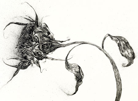 Justin Francavilla Dead Flowers Exhibition Dates: May 1 - June 5 We are proud to announce the second solo exhibition of Brooklyn based artist Justin Francavilla titled Dead Flowers. The exhibition consists of multiple ink drawings and intaglio prints ranging in scale from 22 x 30" to 55 x 96". The drawings and prints continue to explore Francavilla's trademark aggressive style of working while maintaining a fine and delicate line. In addition to Francavilla's technique, aggression plays a large role in the work conceptually. Dead Flowers follows the 2008 exhibition titled I Said You FCKN Die, which explored male competitive force with figures in business suits battling each other with their fists and athletic maneuvers. For this exhibition Francavilla takes inspiration from his garden with dead flowers that take on figurative traits. The flowers seem to be at war with each other but maintain an odd sexual quality. Francavilla graduated from Cooper Union in 2001. He has exhibited his work at Suffolk Community College, Deutsche Bank Art Gallery, Wonderland Art Space in Copenhagen in addition to his two solo shows here at the gallery. He has also had his work published in Harper's Magazine, L Magazine and the New York Magazine Culture Vulture Blog. Opening Reception Saturday, May 5th 3 - 5 pm |