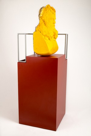 Steven Claydon Total Social Objects April 27 – June 22, 2013 Opening reception: Saturday, April 27, 6:00–9:00pm David Kordansky Gallery is very pleased to announce Total Social Objects, an exhibition of new work by Steven Claydon. The exhibition opens on April 27 and runs through June 22, 2013; an opening reception will be held on Saturday, April 27 from 6:00 until 9:00 pm. Steven Claydon dramatizes and interrogates the ways in which objects have been described, venerated, understood and misunderstood throughout the course of civilization. This process involves a wide range of social, historical, economic, and literary factors, and is intended to differentiate an object's social or anthropocentric 'agency' from its innate, 'thingly' materiality. In Claydon's sculptures, objects are not seen as the antitheses of living things, but as entities that differ from the living by a difference of a degree, possessed of their own 'animism' and with their own capacity for will, hubris, and desire. Total Social Objects focuses on the migration of cultural forms, taking into account both physical movement and the transit of objects through hierarchies of ideas, values, and symbols. The exhibition consists of both floor- and wall-based works, and includes materials as diverse as steel, wood, aluminum, oil paint, straw, cuttlefish ink, and seaweed. Throughout, signifiers borrowed from maritime and shipping contexts have been passed through a visual sieve woven from numerous art historical tropes. Prime examples of this thrust in the work are two sculptures based on canister-like forms that have been rendered in highly finished materials. Claydon transforms the container––itself predicated on absence and what might fill it, like a floating signifier––into a modernist totem perched on self-consciously museological bases. The containers, as forms, are thereby displayed in a state of revolt against the utilitarian or servile roles into which they have traditionally been cast: they are allowed to shine as their own luxurious beings, even as they are elevated to the status of works of art and become cultural 'products' of another kind. Luxury is in fact one of the principal lines of signification that have been woven throughout the show. It can be seen in the color palette of reds, yellows, and neutral tones that unites the disparate materials on display, and keys associations, for instance, to high-end brands and the surfaces they fetishize. However, once displaced in the fictive, quasi-nautical realm that Claydon has created, these same colors simultaneously call to mind the seedier side of cultural transit, one that includes container ships and other purely utilitarian objects. The quality of luxury (especially as it pertains to artworks) becomes but one more burden that humans place upon the supposedly inert objects with which they surround themselves. The exhibition also suggests that high-end objects undergo their own version of tarnish and decay as they are transported from one realm (be it spatial, temporal, or cultural) to another. In Sc-scaffold (London prick), the intensely yellow bust of a bearded figure suggests a paradoxical form, both classical and contemporary in origin; when seen from behind, however, the yellow gives way to a craggy, metallic material reminiscent of sunken treasure, with the word 'London' stamped into its surface in the style of a hallmark. The passage of time is revealed precisely in terms of its material effect, and––as in other works on view that include labels and 'brands' of various sorts, including strange, rune-like symbols more in keeping with science fiction and space travel than sea transport––language points both to identification (familiarity) and loss (missing referents). In a series of wall-based works that straddle the lines between painting, sculpture, assemblage, and reliquary, the network of associations Claydon puts into play can be read as a kind of rebus. Perspex boxes contain various objects, including small, cartoonish, oil-on-linen images of sea creatures performing human activities; ceramic forms that appear to be Chinese dragons; and lengths of straw or video tape. They pose questions about why specific objects end up together, and about what produces the combinations of anthropocentrism and materiality that define them. This is particularly true of Picture Element (aquatic apes YAC), in which a haunting, realistically-rendered painting of a boating scene hovers behind a veil of tinted cellophane, surrounded by a convex laminate frame. The work is part vision, part artifact, a shard of fictional history dreaming its way into reality. Steven Claydon has been the subject of numerous solo exhibitions in institutional contexts, including Culpable Earth, firstsite, Colchester, Essex, England; Mon Plaisir... Votre Travail..., La Salle de bains, Lyon, France; The Ancient Set and The Fictional Pixel, Serpentine Pavilion, London; and Courtesy of the Neighborhood Watch, White Columns, New York. Notable group exhibitions include In the Space of the Beholder | Contemporary Sculpture, from the Sammlung Moderne Kunst, Pinakothek der Moderne, Munich; Soundworks, Institute of Contemporary Arts, London; Secret Societies. To Know, To Dare, To Will, To Keep Silence, Schirn Kunsthalle Frankfurt, Frankfurt, Germany and CAPC de Bordeaux; Time Again, SculptureCenter, New York; British Art Show 7: In the Days of the Comet; At Home/Not at Home: Works from the Collection of Martin and Rebecca Eisenberg, Center for Curatorial Studies, Bard College, Annandale-on-Hudson, NY; Golden Times, Haus der Kunst, Munich; Sympathy for the Devil: Art and Rock and Roll Since 1967, Museum of Contemporary Art, Chicago; and Rings of Saturn, Tate Modern, London. In addition, his work will be included in the upcoming Busted exhibition of outdoor sculpture on the High Line in New York. Claydon lives and works in London. |