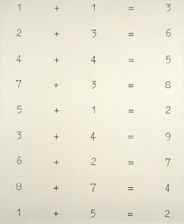 PROOFS AND REFUTATIONS 519 West 19th Street, New York March 11 - April 30, 2011 Opening reception: March 11, 6-8 PM �Corroborations never compare with counterexamples, or even �exceptions�, as catalysts for the growth of concepts.� 1 �Imre Lakatos David Zwirner is pleased to present Proofs and Refutations at the gallery�s 519 West 19th Street space. The exhibition includes work by Francis Al�s, Trisha Brown, Andr� Cadere, VALIE EXPORT, Henry Flynt, Simone Forti, Dan Graham, Georg Herold, Alfred Jensen, Lee Lozano, Man Ray, Bruce Nauman, Max Neuhaus, Adrian Piper, Sigmar Polke, R.H. Quaytman, Dorothea Rockburne, and Al Taylor. This exhibition explores relationships between art and mathematics from the point of view of conjecture and criticism. Among the artworks on view, systems�some mathematical, some not�appear as a source of contradiction or point of argumentation, rather than as a paradigm of intellectual rigor or certainty. In some cases the work reflects the inherent limitations of mathematics. In others cases it makes space for an idiosyncratic or personal engagement with the subject and its forms. The philosopher of mathematics Imre Lakatos argued that �mathematics does not grow through a monotonous increase of the number of indubitably established theorems but through the incessant improvement of guesses by speculation and criticism, by the logic of proofs and refutations.�2 Some of the works on view demonstrate artistic processes that resemble the active, searching, and provisional nature of mathematical activity itself. Others exhibit a healthy skepticism towards logic or incorporate mathematical notions and procedures into poetic proposals. 1. Playing with axiomatic systems and what mathematician Hermann Weyl termed the �range of indeterminacy�3 made available by logical deduction is a strategy shared by several artists in the exhibition. The large scale composition in paper, chipboard, and graphite Set (1970) by Dorothea Rockburne was inspired by her own study of the foundations of mathematics. As Robert Pincus-Witten has written of related work by the artist, �This is an art of demonstration rather than illustration. [�] The process of thought itself is the subject of this art.�4 Al Taylor shows how artists sometimes work like mathematicians in setting out rules while continuously expanding the domain of their definitions. The three-dimensional construction Odd Vows (Bern) (1992) is created from an idiosyncratic ordering of numerals and vowels via painted plywood and metal stakes. In keeping with the artist�s practice, the work functions as a model for making drawings. In the sculpture Dead End Tunnel Folded Into Four Arms with Common Walls (1980), Bruce Nauman devises a system of continuous transformation from elementary geometric forms, and yet its rudimentary quality suggests the unfolding of a proposition or theory through a spatial model. Marco De Michelis has described this aspect of Nauman�s work in terms of a �mental architecture� that the viewer reconstructs in spite of the �deliberate overlaps of contradictory information, which multiply their meanings and preclude any uniform perception, whether emotional, psychological, or physiological.�5 Trisha Brown�s dance constructions are composed from simple movements in combination. The video Line Up (1976) consists of several loosely choreographed works, starting with an �equipment piece� in which the dancers lie on their backs, holding long sticks from end to end. The fragile arrangement offers an unusual physical apprehension of line and measurement that embraces its flaws. 2. �Mathematics, this product of human activity, �alienates itself� from the human activity which has been producing it. It becomes a living, growing organism, that acquires a certain autonomy from the activity which has produced it; it develops its own autonomous laws of growth, its own dialectic.�6 The �certain autonomy� of mathematics results in unexpected forms and structures. The photograph Mathematical Object (1936) by Man Ray depicts a plaster model of a mathematical surface. The artist photographed several mathematical models, dating from the period 1870-1930, at the Poincar� Institute in Paris, demonstrating their surreal qualities. Later, Man Ray created a series of paintings based on these models, naming them the Shakespearian Equations; a photograph of another model was the inspiration for the painting in the exhibition Much Ado About Nothing, (1949). R. H. Quaytman also worked from a mathematical model for her painting Conical Wedge (2011), created for the exhibition. The upper edges of the planes in the fan-like arrangement depicted in this work approximate the eponymous mathematical surface, while also recalling the spine of a book. Adrian Piper appeals to the numerical imagination in her Nineteen Concrete Space-Time Infinity Pieces (1968-69), a sequence of conceptual proposals gathered in a standard ring binder. As she explains in the introductory page, �My present work is involved with the general nature of time and/or space,� or infinity. 3. Other artists remind us that despite its abstraction, mathematics is a human activity and it cannot be entirely insulated from political and psychological forces. VALIE EXPORT became known in the 1960s and 70s for her provocative performance, film, and photography-based works that challenged dominant �male� values. The exhibition includes a selection of vintage prints from the artist�s �Body Configurations� (1972-82), a series of works documenting EXPORT physically conforming her body to the rational structure of the surrounding architecture. This bodily inscription is sometimes accentuated by hand-drawn geometric lines. Georg Herold�s photograph Cube I (1987/2003) echoes the trappings of the classroom or lecture hall. A self-portrait, the artist stands in suit and tie beside a podium on which a cubical wooden fra