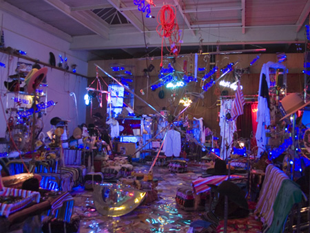 Images: Jason Rhoades Black Pussy, 2006 Mixed media installation including wire metal shelving, neon glass, dreamcatchers, cowboy hats, Chinese Gonshi stones, hookah pipes, camel saddle footstools, glass vegetables and other items. Approximate dimensions: 2960 sq. ft. Photographs by Douglas M. Parker Studio Courtesy Estate of Jason Rhoades; Galerie Hauser & Wirth, London and Zurich; David Zwirner, New York Jason Rhoades� untimely death in 2006 at age 41 cut short a career which, through the sheer audacity, scope, and ambition of his prolific artistic output since 1993, promised to make him one of the defining artists of his generation. While often perceived as a maverick - constantly changing styles, materials, and intellectual approaches for each project, it is the very continuity and reoccurrence of Rhoades� most important concepts and concerns throughout his career that is the hallmark of his final exhibition, Black Pussy, conceived by the artist in 2005 and 2006 and completed in Rhoades� studio shortly before his death. The last installment in a trilogy of work that includes Meccatuna (2003) and My Madinah: in pursuit of my ermitage�(2004), Black Pussy remains one of Rhoades� most mysterious works, and his most ambitious. Sprawling roughly 3,000 square feet, the work presents itself as a large installation, dominated by an empty stage bearing a neon sign which reads �Live in the Black Pussy.� The work also features 185 neon pussy word signs, as part of the artist�s ongoing project of creating a cross-cultural compendium of synonyms for female genitalia. Large storage racks are covered with myriad objects, including hundreds of Egyptian Hookah pipes from a seized shipping container, over 350 unique Dream Catchers (a traditional Native American fetish object used to filter dreams), 89 beaver-felt cowboy hats, 72 Chinese Scholar stones, Venetian glass vegetables (and Chinese knock-offs), colorful cloth rugs, a homemade aluminum replica of Jeff Koons� famous stainless steel Rabbit (1986), and more. To one side, a large macram� textile object covers the wall. Beyond the formal juxtapositions created, the individual elements in the massive installation interact symbolically, communicating dichotomous relationships of masculine versus feminine, Eastern versus Western traditions, the handmade versus the mass-produced, and the authentic versus the fake. Black Pussy is foremost a sculpture; however it is not merely the result of material objects chosen by the artist, but also the activities of participants in the ten Black Pussy soir�es held in his Los Angeles studio. For a period of six months, the artist invited a small group of selected guests to attend a series of events officially known as Black Pussy Soir�e Cabaret Macram� . Though seemingly improvised, these evenings were highly structured hybrids of performance, Happening, dinner party, and art opening. Rhoades hired performers, but also expected a high level of guest participation with the intention that these soir�es would add to the constantly evolving Black Pussy installation. Each guest not only contributed a new personal pussy word to his encyclopedic list, but also a bit of themselves in the form of charisma�their intangible and individual spiritual power. The events were heavily documented in the form of photographs, which were both physically incorporated into the installation and used to compile a coffee table book, and also in the form of a soundtrack, which became a part of the work itself. Only after the addition of sound - the auditory remains of the cycle of soir�es � did Rhoades consider the sculpture complete. It is important to note that Rhoades did not intend to continue the soir�es once the work was shown in a different context. These events were clear extensions of the artist�s studio practice, creating not only an aura for the work, but also turning the ephemeral quality of the participatory evenings into concrete material for his sculpture. The varied materials found in Black Pussy, the formal density, and the strange soundtrack (especially powerful today, as we mostly hear the artist�s voice) create a narrative of utmost complexity, or conversely, multiple narratives. An undoubtedly provocative title, Black Pussy refers most directly to the darkness of the cavernous installation within Rhoades� studio and the ultraviolet lights which are the sole sources of illumination in the space. The notion of absence, so powerfully illustrated by the empty stage and the disembodied voices on the soundtrack, is especially poignant when we contemplate Rhoades� favorite white suit, which the artist placed in the middle of the piece, in lieu of a signature, just days before he died. While Rhoades could be the most dazzling colorist and materialist (as is abundantly evident in Black Pussy), it is really his conceptual vigor that frames and connects his oeuvre, and makes him the ultimate artists� artist, not only as someone who commands the respect of his peers, but as an artist who redefined the arena in which art is possible, and tried to expand the boundaries of this arena. The conditions under which art is made, shown, and consumed were sources of enormous interest for Rhoades, and it is his continuous assault on these conditions and rules that made his work so challenging and fascinating. For Rhoades, the creative process demanded ultimate freedom. His work could be dangerous, overwhelming, politically incorrect, obnoxious, or utterly sublime. Rules and conventions were materials for Rhoades, and he subverted them not out of bratty adolescent impulses, but because he understood them to be safety nets in the art-making process, and knew that, once these were removed, there lay a whole new set of challenges for the artist and his audience. Rhoades� work can be both physically and visually demanding, yet it is its intellectual challenges which often prove most daunting. It takes a