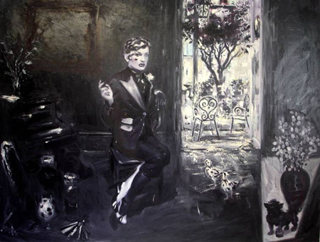 PHILIP JONES House of Cards 16th September to 25 October, 2008 Private view: Thursday, 16th September 2008, at 20:00 Espacio M�nimo gallery opens its 2008-2009 season with British artist PHIL JONES�s first Spanish solo-show. The show is made up of 5 large format paintings, and a similar number of smaller works expressly made for the show, which were started in 2007 and completed in 2008, and will be collected under the title House of Cards. PHILIP JONES paintings are atypical, strange and mysterious, and portray a savage and colourful world. Theatrical and chameleonic characters pose within an enigmatic universe of patterns, geometry, and fluid painting. It is not difficult to track the diverse influences upon these works, from James Esnor to Willem de Kooning, from Bonnard to Josef von Stemberg, from Tal R to Picasso, from Vuillard to Cecil Beaton, from Hockney to No�l Coward, from Richard Lindner to Tallulah Bankhead� In these works we find a structure of patterns and symbols, a fragile structure that evokes characters from playing cards. They are iconic, life size figures that pose histrionically as if taken from a 1930�s romantic comedy. PHILIP JONES recreates a universe plagued with dandies, poets, models, and actors. Whilst impeccably dressed and excessively made-up these ambivalent, sophisticated and disturbing creatures inhabit a scenery of fragmented light. They are hermetic figures with hollow gazes, refined aesthetes, slightly perverse, and presumably immoral. The artist uses the paint in different ways to suggest different types of light or surface, but also different feelings or emotional states creating intimate ambiguous dramas of the human condition. The paint becomes emotional material, analogous to states of mind, or emotional perceptions. His paintings are filled with sculptural figures, with optical illusions that turn into liquid paint, into light and shadow, to create a decorative, mutant world like a catalogue of patterns, colours, and forms, or a plague of signs, markings, and traces. He uses imagined symbols, metaphorical fantasies to produce dramatized moments of poetic evocations. He invents an artificial world in which elegance and coarseness, refinement and brutality live side by side. Seen as a group, the paintings that make up House of Cards offer an exciting impression, a drama of colour, of opulence, and of trauma. |